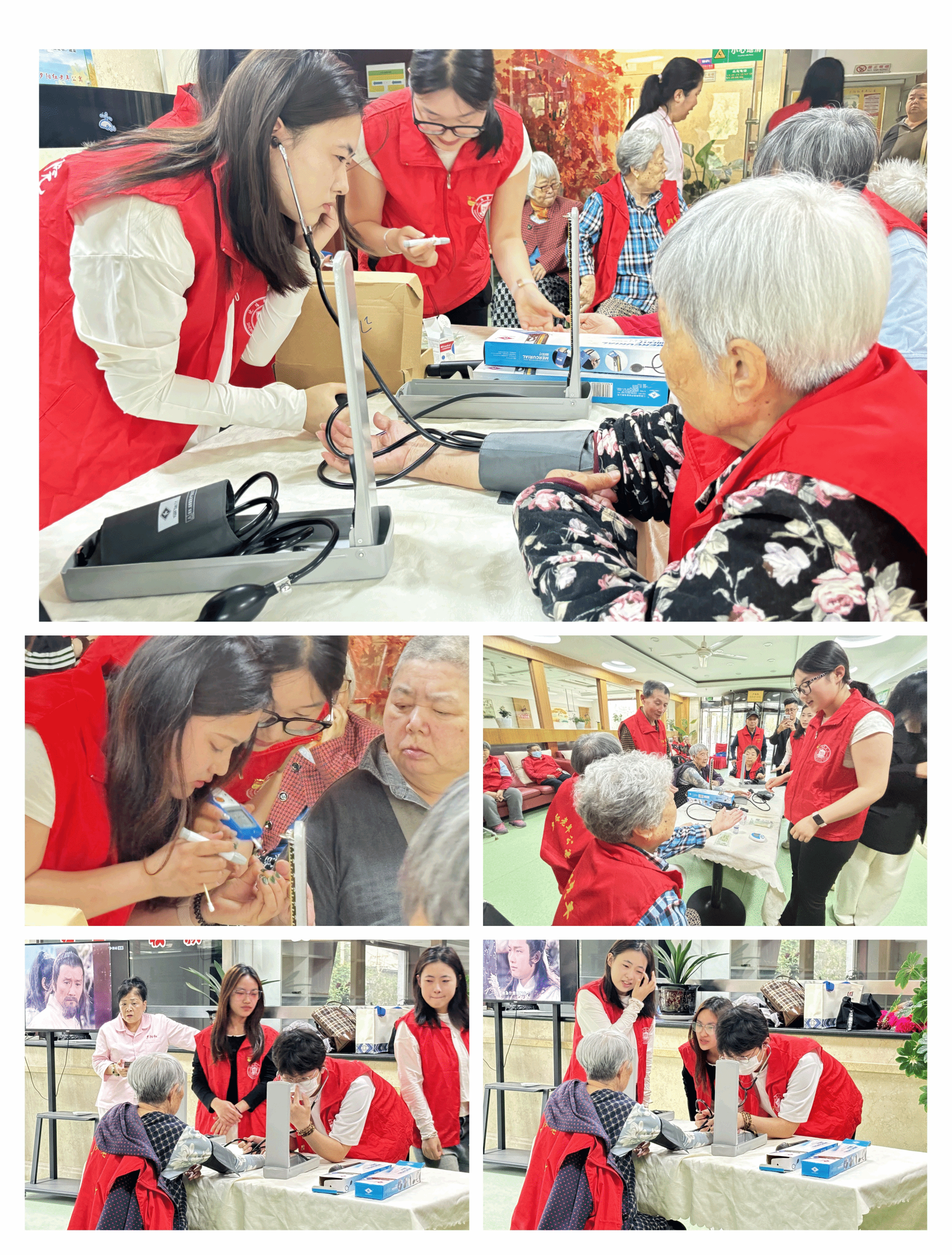 此外,护理学院暖夕社团的成员们还为老人们测量血压、测量血糖,用实际行动传递关爱。