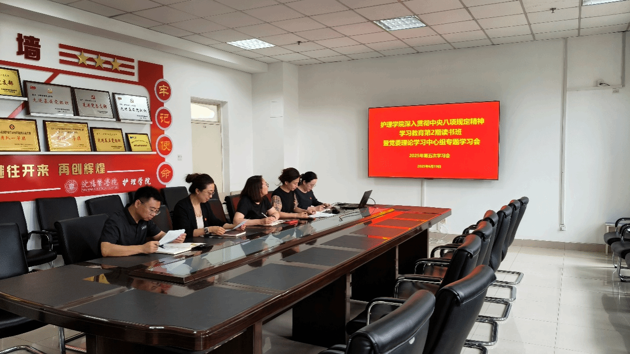 6月19日,护理学院党委召开深入贯彻中央八项规定精神学习教育第2期读书班暨党委理论学习中心组专题学习会。会议深入学习贯彻习近平总书记关于加强党的作风建设的重要论述,认真学习领会党的十八大以来深入贯彻中央八项规定精神取得的显著成效和积累的宝贵经验。学院领导班子成员参加读书班,学院党委书记叶琳主持会议并讲话。