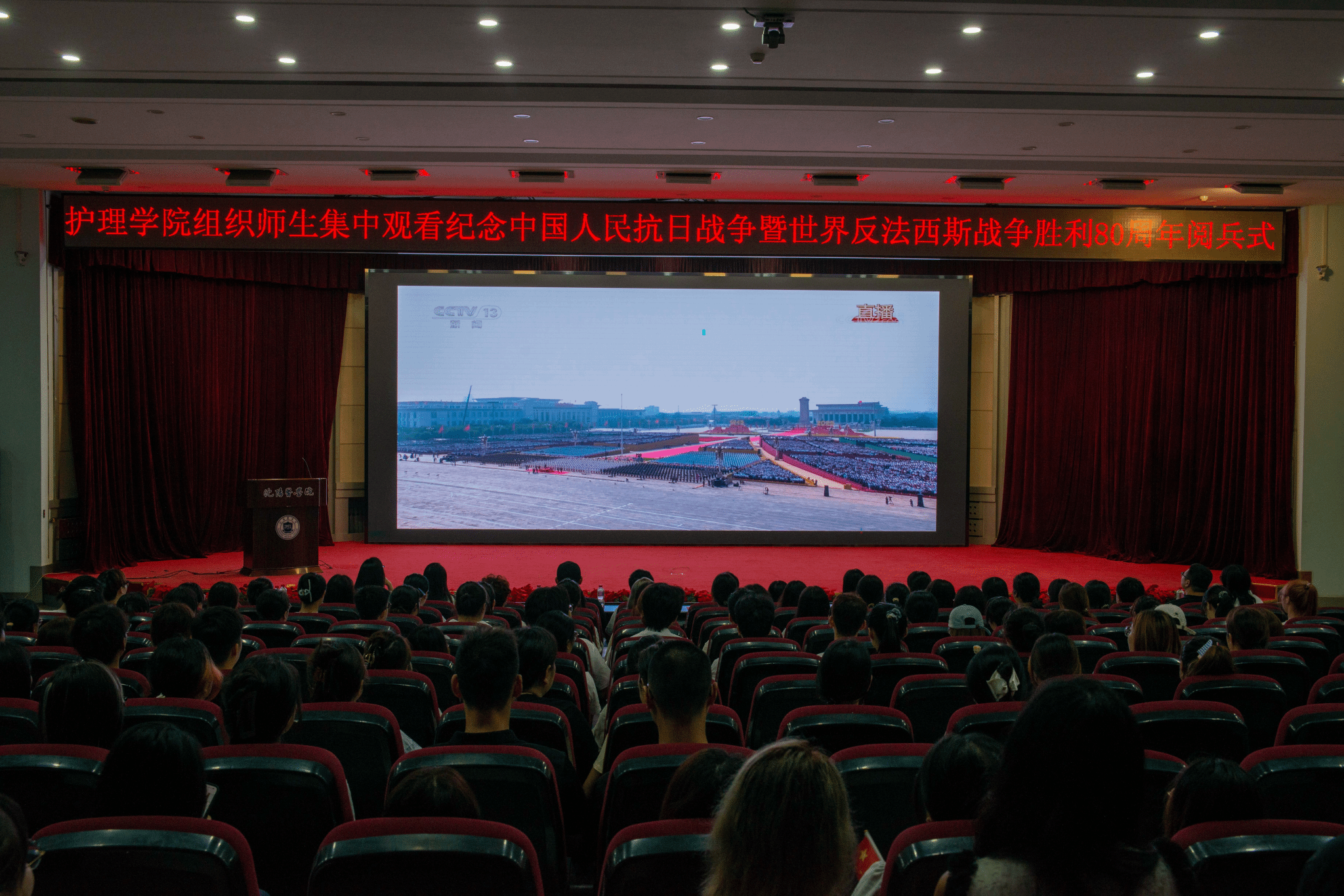 为纪念中国人民抗日战争暨世界反法西斯战争胜利80周年,弘扬伟大抗战精神,激发师生的爱国情怀与历史使命感,9月3日上午九点,护理学院在图书馆六楼学术报告厅和学院会议室组织全体师生集体观看中国人民抗日战争暨世界反法西斯战争胜利80周年阅兵仪式。
