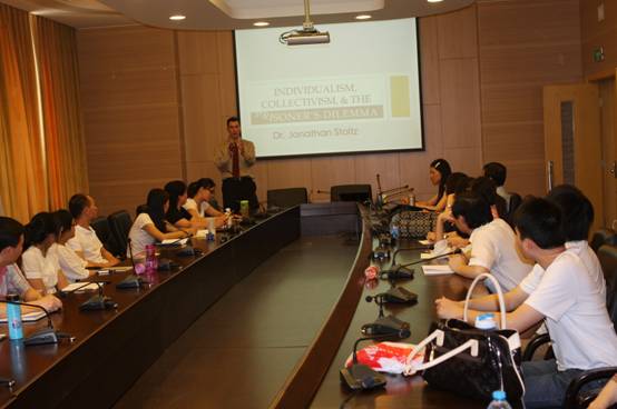 5月22日下午,beat365beat365在线唯一官网主办的“百川讲堂”活动正式在学术会堂603拉开帷幕。第一期由富布莱特访问学者、美国St. Thomas大学哲学系副教授Jonathan Stoltz主讲,主题为”Individualism, Collectivism, and the Prisoner’s Dilemma”,陈文娟副教授担任主持。Stoltz教授从哲学和逻辑学的视角给beat365师生带来了一场理性思辨的盛宴。