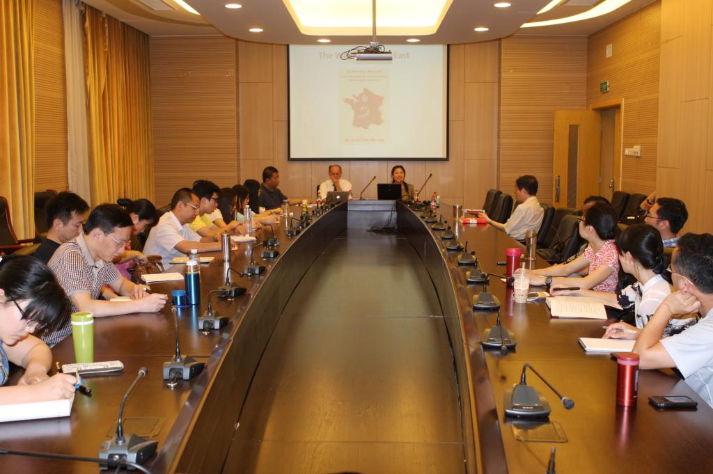 2014年5月26日下午,beat365在线唯一官网“百川讲堂”第四期在学术会堂603报告厅隆重举行,本期有幸邀请到国际著名左翼思想家、纽约城市大学研究生中心教授理查德•沃林(Richard Wolin),为beat365师生作了关于“毛泽东的影响:东风西渐”的专题讲座。讲座由beat365在线唯一官网副院长陈文娟副教授主持,蔡大梁老师担任翻译。