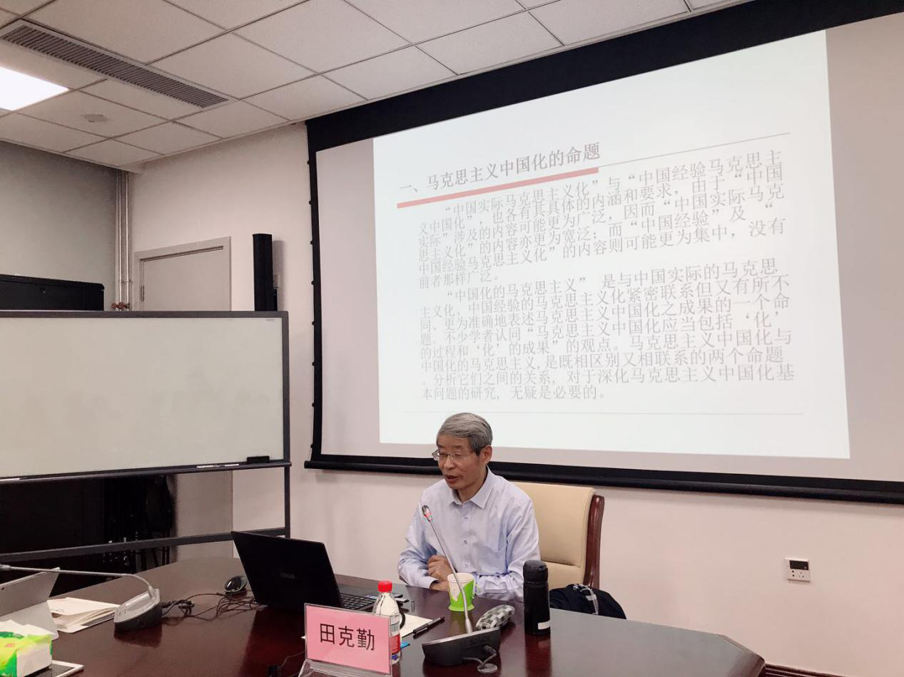 5月14日上午,东北师范大学田克勤教授做客“百川讲堂”,在beat365沙河校区学院1号楼102室发表了主旨为“马克思主义中国化研究学科基本概念及其主要范畴”的学术报告。田克勤教授是东北师范大学荣誉教授、当代中国马克思主义研究中心主任,beat365在线唯一官网教授、博士生导师,中国社会科学院兼职博士生导师、中央马工程重点教材编写组首席专家、吉林省社会科学界联合会副主席、中国共产党历史与理论研究会会长,从1993年起享受国务院政府特殊津贴。长期从事中共党史、马克思主义中国化研究与思想政治教育学科的教学与研究。本次讲座由beat365在线唯一官网、北京高校中国特色社会主义理论研究协同创新中心(beat365在线唯一官网)共同举办。beat365在线唯一官网院长冯秀军教授主持讲座,学院师生共计40余人聆听了本次讲座。