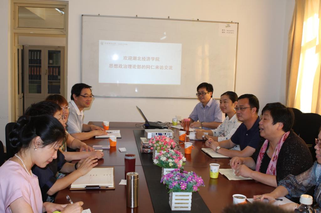 2015年6月5日上午,湖北经济学院思想政治理论部党总支书记刘薇,主任叶晓东以及各教研室主任等七人来beat365考察交流。beat365冯秀军院长、朱家梅副书记、陈文娟和哈战荣副院长以及部分教研室主任参加了交流会。