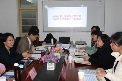 2015年11月6日上午,上海对外经贸大学beat365在线唯一官网长张桂芳教授等一行五人来beat365考察交流。beat365冯秀军院长、朱家梅副书记、陈文娟和哈战荣副院长以及各教研室主任参加了交流会。