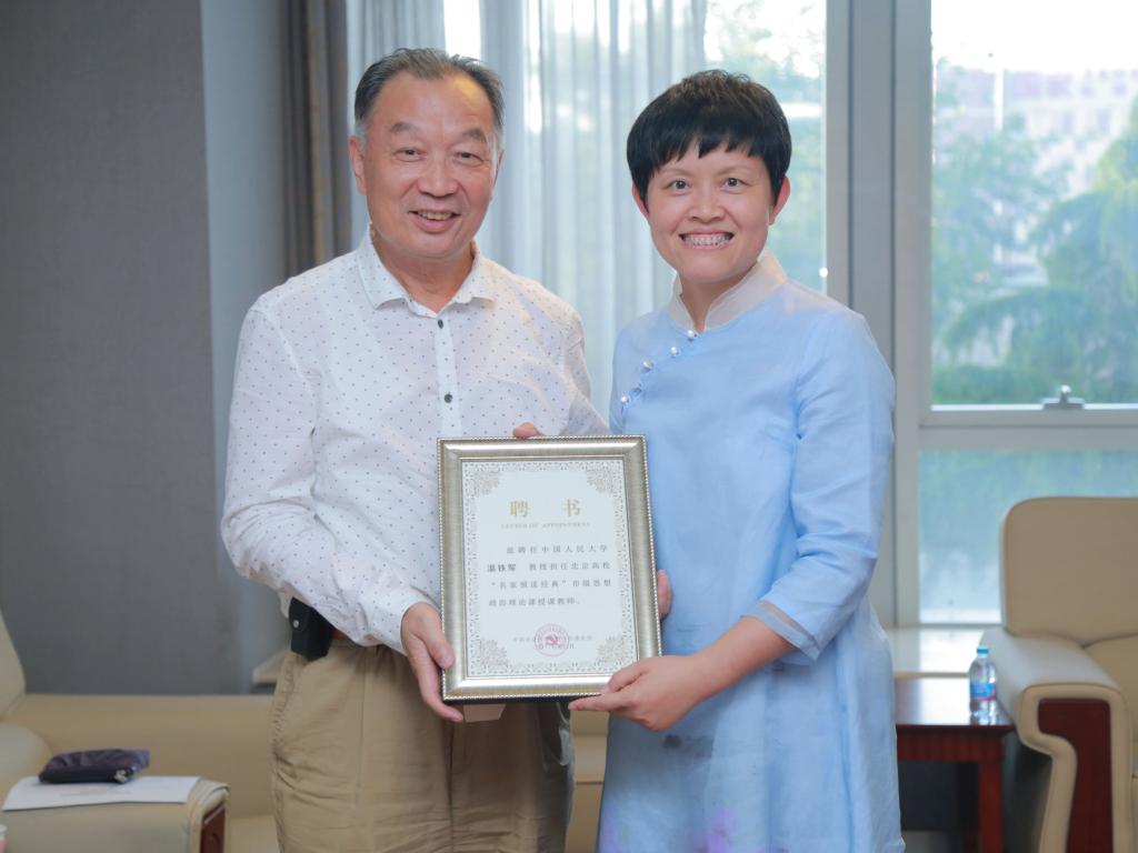 授课前,beat365校长助理朱凌云热情会见了温铁军教授,与其就大学生读书读经典、人文素质培养、中国当前农村发展现状等问题进行了深入交流,并代表课程组为温铁军教授颁发了“名家领读经典”课程授课教师聘书。