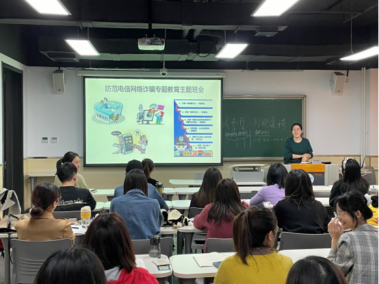在主题教育班会中,徐芳老师针对当前社会流行的几种常见电信网络诈骗形式对与会学生进行了详细讲解,帮助学生充分意识到传统以及新型电信网络诈骗的常见形式和特征;同时帮助学生明确了电信网络诈骗存在的严重危害性,并为学生传授在遭遇相应情况时的应对方法。