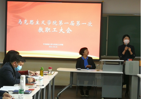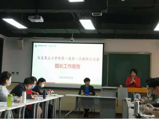 下午两点,大会在雄壮的国歌声中正式开幕。会上,院长冯秀军同志做学院2020年度工作总结报告、财务报告和2021年度学院工作计划。她指出,2020年是不平凡的一年。突如其来的新冠疫情改变了世界,影响了每个人的工作和生活。一年来,学院以习近平新时代中国特色社会主义思想为指导,深入学习贯彻党的十九大及十九届二中、三中、 四中和五中全会精神,树牢“四个意识”、坚定“四个自信”、做到“两个维护”,认真贯彻落实教育部、北京市和学校的各项工作部署,认真落实立德树人根本任务,积极回应挑战,努力克服困难,推动学院各项工作改革发展。这一年,在全院师生员工的共同努力下,学院以党建促发展提升了党的建设质量、通过深化教学改革提升了思政课教学影响力、稳步推进学科队伍建设成效显著、多举措推动学术交流创新科研成果丰硕、充分发挥专业优势积极服务国家社会需求,这些成绩的取得,是学院全体师生长期以来辛勤付出和共同努力的结果。