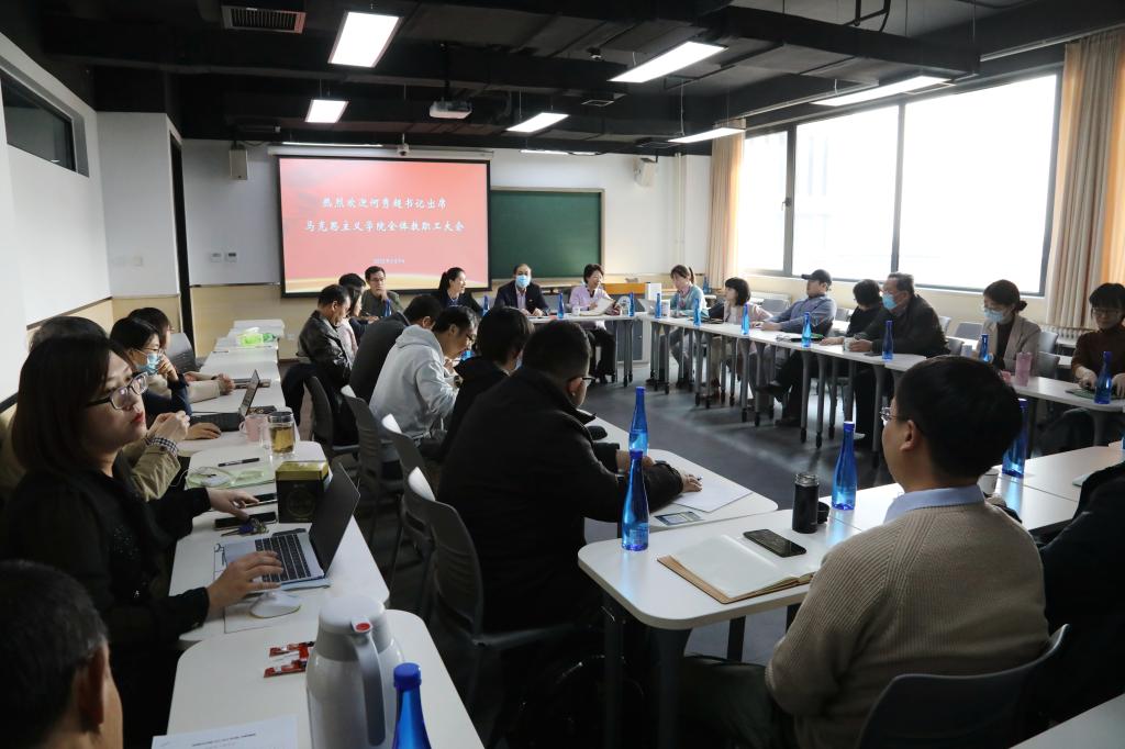 最后,何书记指出学校特别重视马院建设,马院这几年的建设成果有目共睹,学校将尽全力为马院事业发展提供支持。何书记结合2022年学校的工作要点对马院工作提出了以下要求。一是要吃透中央和上级文件精神,特别是在迎接2022年二十大时,要有马院的声音,要有马院专家引领。二是要结合学校工作,加强顶层设计。三是要突出重点,打造全新思政课,升级思政课2.0,在课程思政上马院要发挥引领作用,发挥对课程思政的引领作用。四是加强合作,协同攻坚,加强科研文章的产出。五是要发挥马院优势,一起向未来。