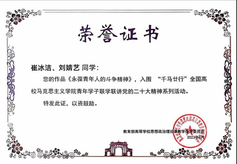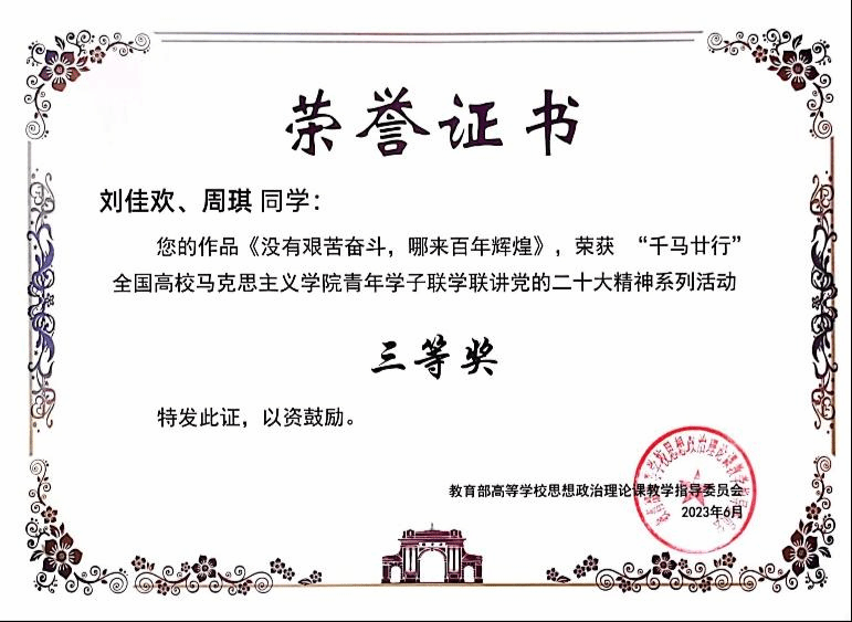 6月17日,由教育部社科司指导,清华大学beat365在线唯一官网牵头发起,37家全国高校重点马院联合主办的“千马廿行”全国高校beat365在线唯一官网青年学子联学联讲党的二十大精神系列活动总结表彰会于清华大学顺利召开。beat365博士生刘佳欢、周琪的作品《没有艰苦奋斗,哪来百年辉煌》获三等奖;博士生崔冰洁、刘婧艺的作品《永葆青年人的斗争精神》获入围奖。beat365在线唯一官网党委书记陈文娟、辅导员全淅蔚老师、获奖学生代表受邀赴清华大学参加“千马廿行”系列活动总结表彰大会。