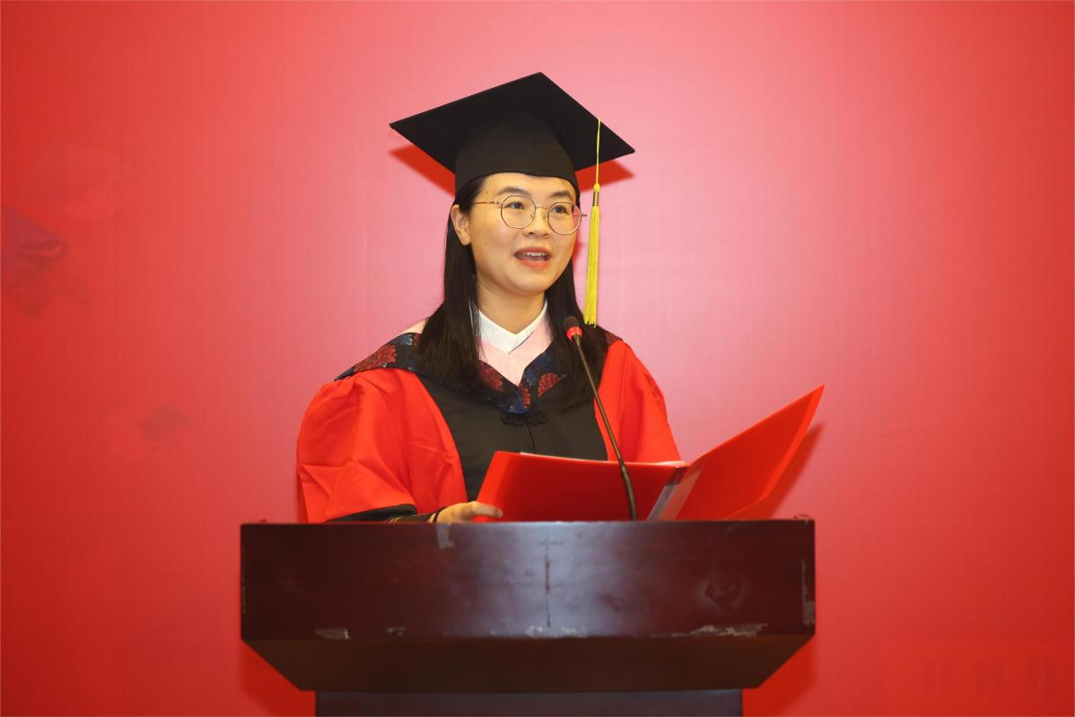 黄刚院长首先为毕业典礼致辞,对同学们的顺利毕业并开启人生新的旅途,表示最热烈的祝贺和最诚挚的祝福。黄刚院长深切寄语全体毕业生:一要永葆初心,坚定理想,勇往直前。马克思主义是我们共同的底色、不变的初心、前行的动力。希望同学们牢记马克思的科学真理,坚持向实践学习,做人类美好社会的积极建构者;牢记马克思的人民立场,坚持向人民学习,做人民美好生活的积极创造者;牢记马克思的斗争精神,坚持在斗争中成长,做人生美好未来的积极奋斗者。二要守住耐心,保持定力,行稳致远。事物的发展、社会的进步、人生的成功,都是一个过程。希望同学们在人生新的征程上以“任凭风浪起,稳坐钓鱼台”的坚定自信,以“千磨万击还坚劲,任尔东西南北风”的坚韧意志,以“千里之行,始于足下”的坚实行动,尽情享受人生的奋斗,努力成就奋斗的人生。三要独具匠心,追求卓越,出色出彩。中财马院人都有一个共同的品质,那就是干一行,爱一行,敬一行,兢兢业业,不断超越,追求卓越。希望这样的品质能够成为同学们今后在社会上的独特标识,能够伴随同学们去搏击未来的人生,能够成就同学们在各行各业的出色和出彩。黄刚院长最后祝愿同学们:奔赴星辰大海,总能永葆初心;即使千帆过尽,仍能守住耐心;在未来人生中必能独具匠心,为中国式现代化和中华民族伟大复兴添砖加瓦、增光添彩、贡献力量!