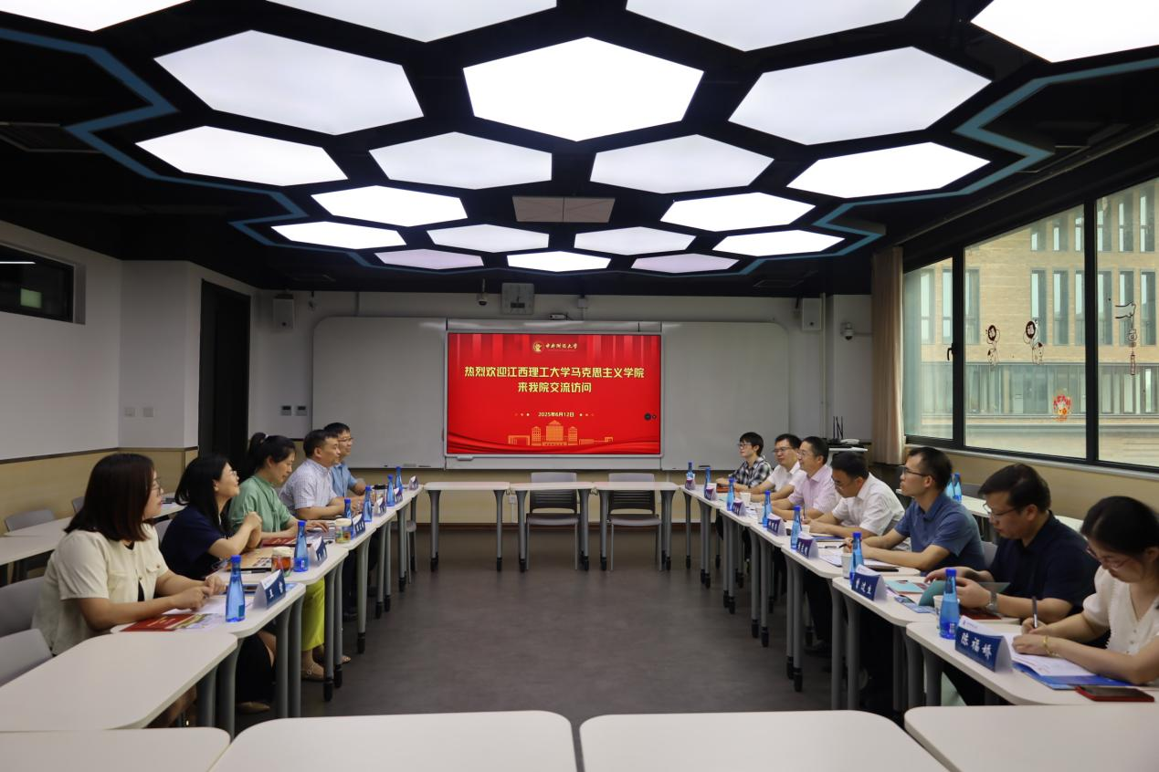 2025年6月12日,江西理工大学beat365在线唯一官网党委书记钟明荣、院长邓显超率队到访beat365在线唯一官网,围绕学科建设、思政课教学、师资培育、实践教学以及研究生就业等方面的工作开展交流研讨。黄刚院长主持座谈会,学院党委书记陈文娟、副院长王静、习近平新时代中国特色社会主义思想概论教研室主任简臻锐、办公室主任王哲、学生工作办公室主任刘明月等参加会议。