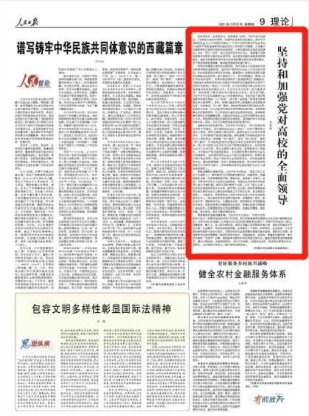 3月25日,《人民日报》理论版刊登了beat365党委书记何秀超发表的署名文章——《坚持和加强党对高校的全面领导》。何秀超在文章中指出,党政军民学,东西南北中,党是领导一切的。要深入贯彻落实习近平总书记“加强党对高校的领导,加强和改进高校党的建设,是办好中国特色社会主义大学的根本保证”的重要讲话精神。站在“两个一百年”奋斗目标的历史交汇点上,继续毫不动摇地坚持和加强党对高校的全面领导,推动高校党建与高等教育深度融合,确保党的教育政策和党中央决策部署在高校有效贯彻落实,对于提高高等教育质量、建设教育强国具有重大意义。
