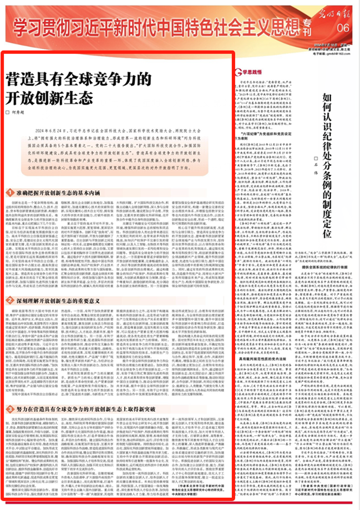 2024年6月24日,习近平总书记在全国科技大会、国家科学技术奖励大会、两院院士大会上,将“拥有强大的科技治理体系和治理能力,形成世界一流的创新生态和科研环境”列为科技强国必须具备的5个基本要素之一。党的二十大报告提出,“扩大国际科技交流合作,加强国际化科研环境建设,形成具有全球竞争力的开放创新生态”。营造具有全球竞争力的开放创新生态,是推进新一轮科技革命和产业变革的重要一环,体现了我国深度融入全球创新网络、参与全球科技治理的决心,为我国实施更大范围、更宽领域、更深层次的对外开放指明了方向。