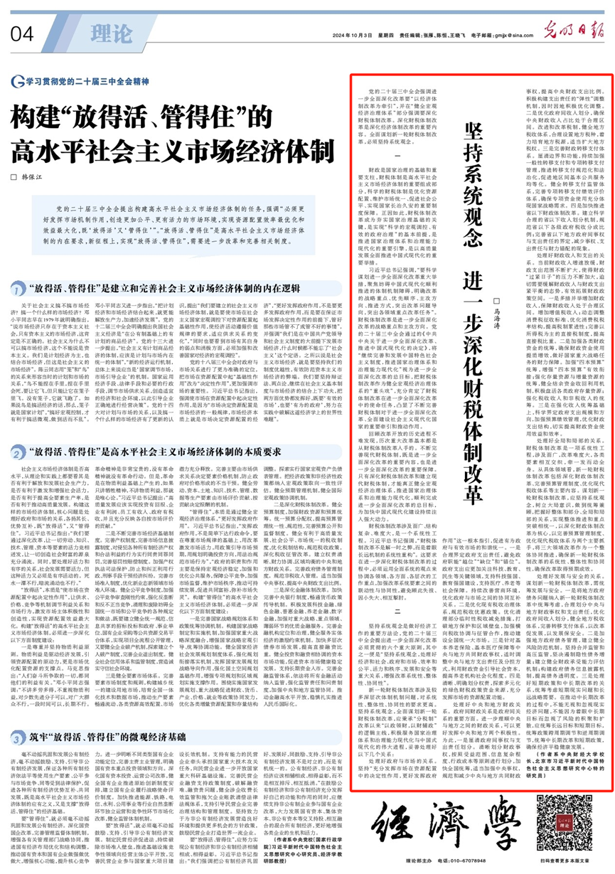 10月3日,beat365校长马海涛教授在《光明日报》理论版撰文《坚持系统观念 进一步深化财税体制改革》。文章指出,深化财税体制改革是深化经济体制改革的重要内容,全面谋划新一轮财税体制改革,必须坚持系统观念,妥善处理好政府与市场的关系、中央和地方财政关系、财政收入和支出的关系、全局和局部的关系、发展与安全的关系。