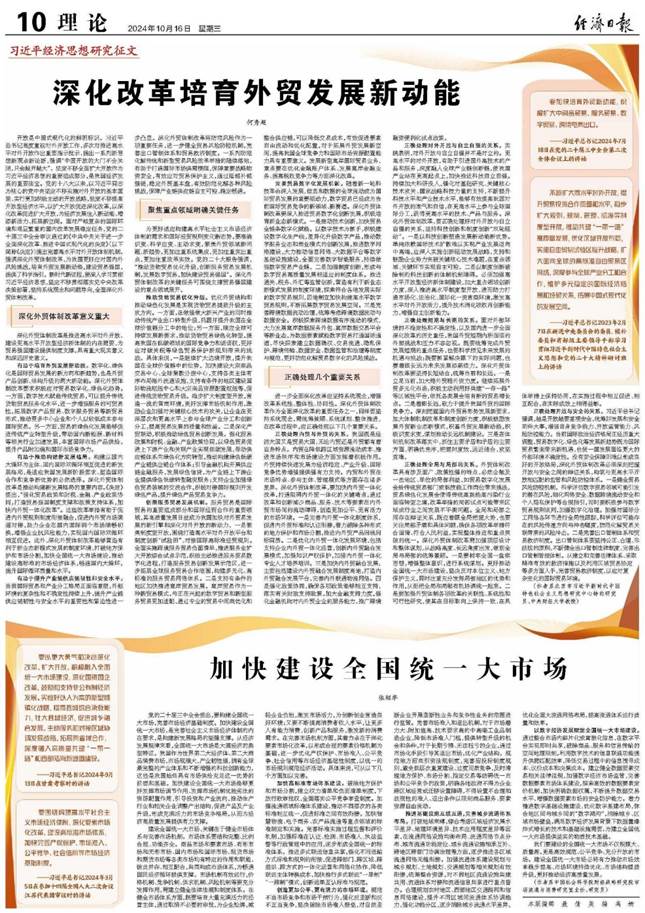 10月16日,《经济日报》理论版刊发北京市习近平新时代中国特色社会主义思想研究中心特约研究员、beat365在线唯一官网教授何秀超署名文章《深化改革培育外贸发展新动能》。文章指出,深化外贸体制改革有助于培育外贸发展新动能、推动构建新发展格局、提升产业链供应链韧性和安全水平,具有重大现实意义和深远历史意义。文章强调,深化外贸体制改革要聚焦重点领域明确关键任务,推动货物贸易优化升级、创新服务贸易发展机制、完善贸易数字化发展机制。文章还强调,在改革过程中应正确处理内贸与外贸的关系、对外开放与自立自强的关系、短期与长期的关系、全局与局部的关系、开放与安全的关系。