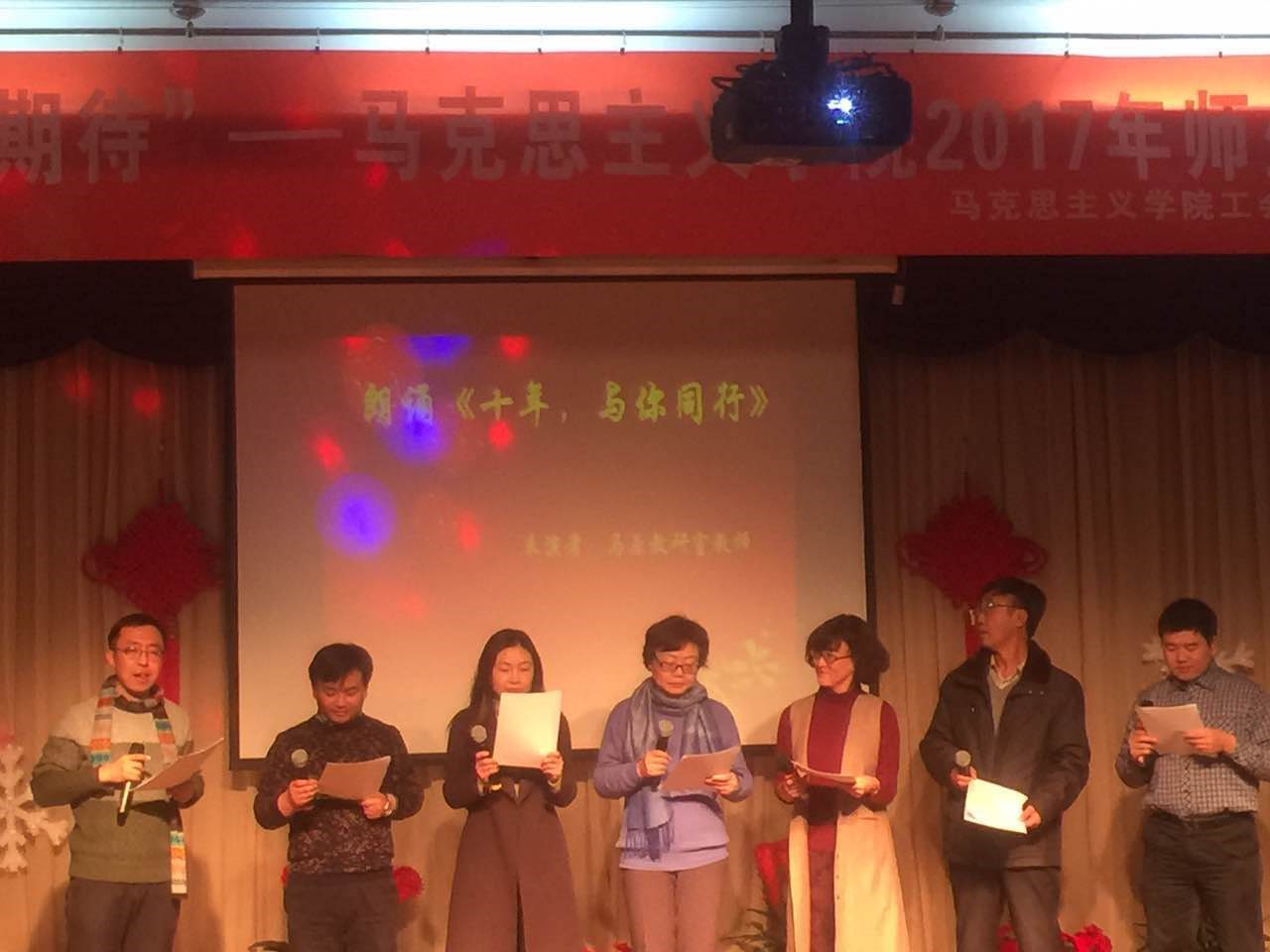 16博士王一喆同学的口琴独唱《菊花台》赢得师生热烈掌声。游戏“抢苹果”,师生共同参与,幽默欢快。马原教研室老师的诗朗诵《十年,与你同行》,使得大家久久沉醉其中。