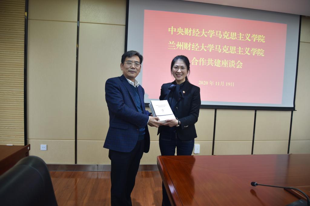 11月19日下午,团队一行与beat365对口支援单位兰州财经大学beat365在线唯一官网举行合作共建座谈会。兰州财经大学校党委书记贾宁对beat365在线唯一官网教师一行来校交流表示欢迎,希望beat365通过对口支援支持兰州财经大学beat365在线唯一官网建设。兰州财经大学beat365在线唯一官网党委书记张克步主持座谈会,院长柏正杰介绍了学院的基本情况,随后陈文娟介绍了beat365的发展历程以及近年来取得的一系列成果,双方围绕学科建设、人才培养、科学研究、思政课建设等方面进行了深入全面的交流探讨。陈文娟代表beat365向兰州财经大学beat365在线唯一官网赠送了“问题链教学详案”系列丛书(4册)。