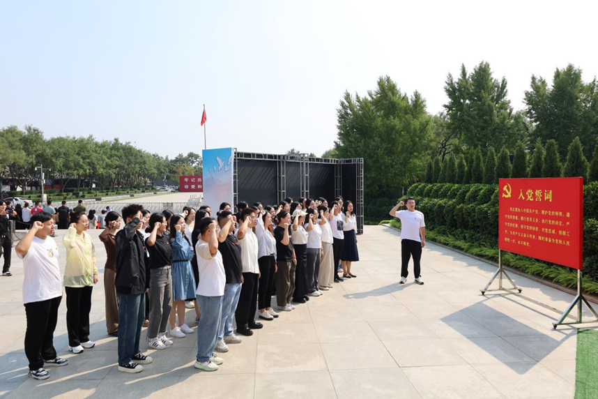在中国人民抗日战争纪念馆前,全体师生党员面向鲜红的党旗整齐肃立,高高举起右拳进行庄严的入党誓词宣誓。声声誓言表达着对党的无限热爱与忠诚,也激励着师生党员们不忘初心、牢记使命,坚定不移听党话、跟党走的坚强决心。