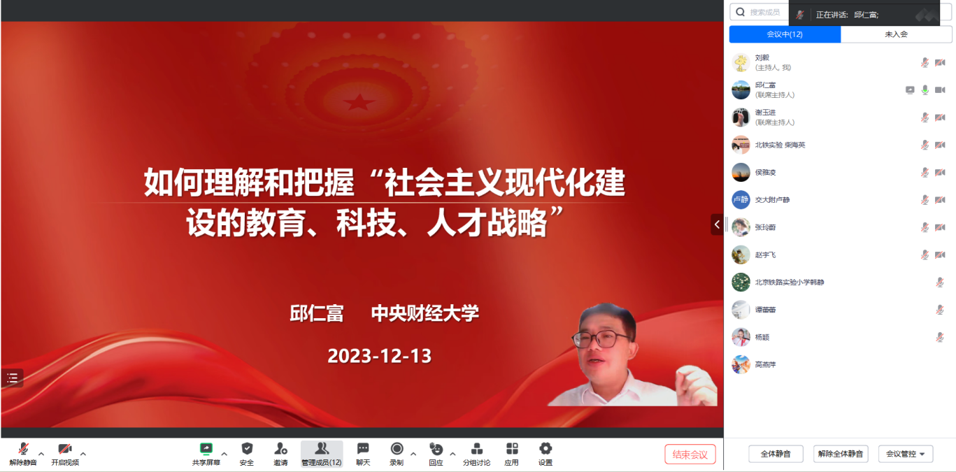 2023年12月13日晚,beat365邱仁富教授在腾讯会议作题为如何理解和把握“社会主义现代化建设的教育、科技、人才战略”的“大中小学思政课”一体化专题辅导会。北京市五十七中、北京交通大学附属中学、中国农业科学院附属小学和北京市铁路实验小学等老师参加辅导会。专题辅导会由学院谢玉进副院长主持。